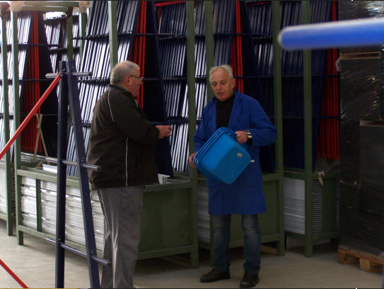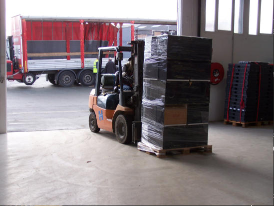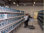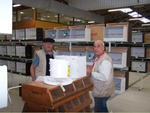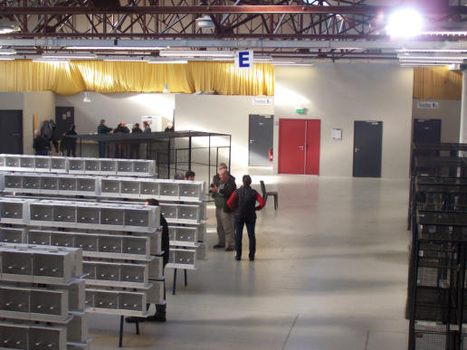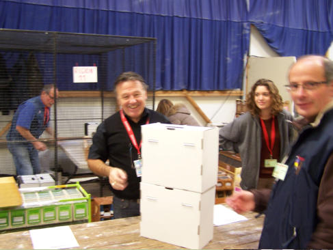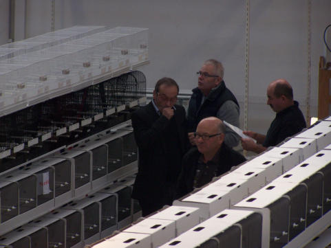 Les convoyeurs sortent les oiseaux des cageots de transport puis les placent dans