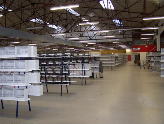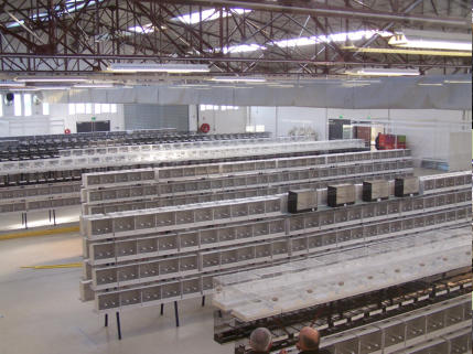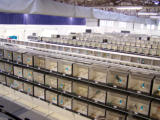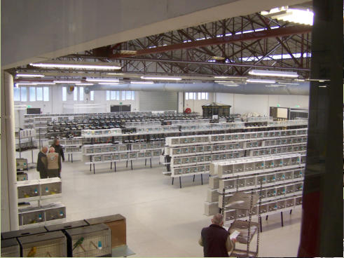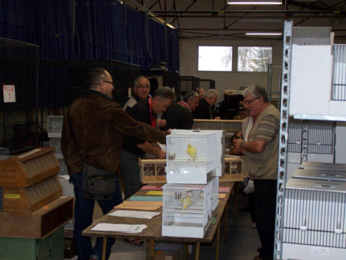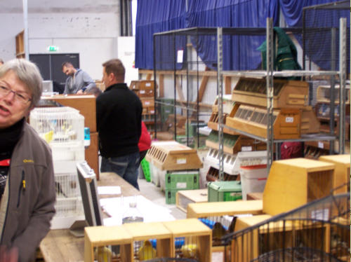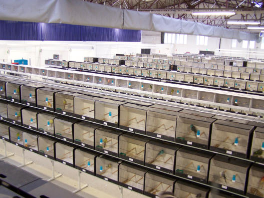 Les cages bien alignées sur les présentoirs, avec les graines dans les mangeoires.