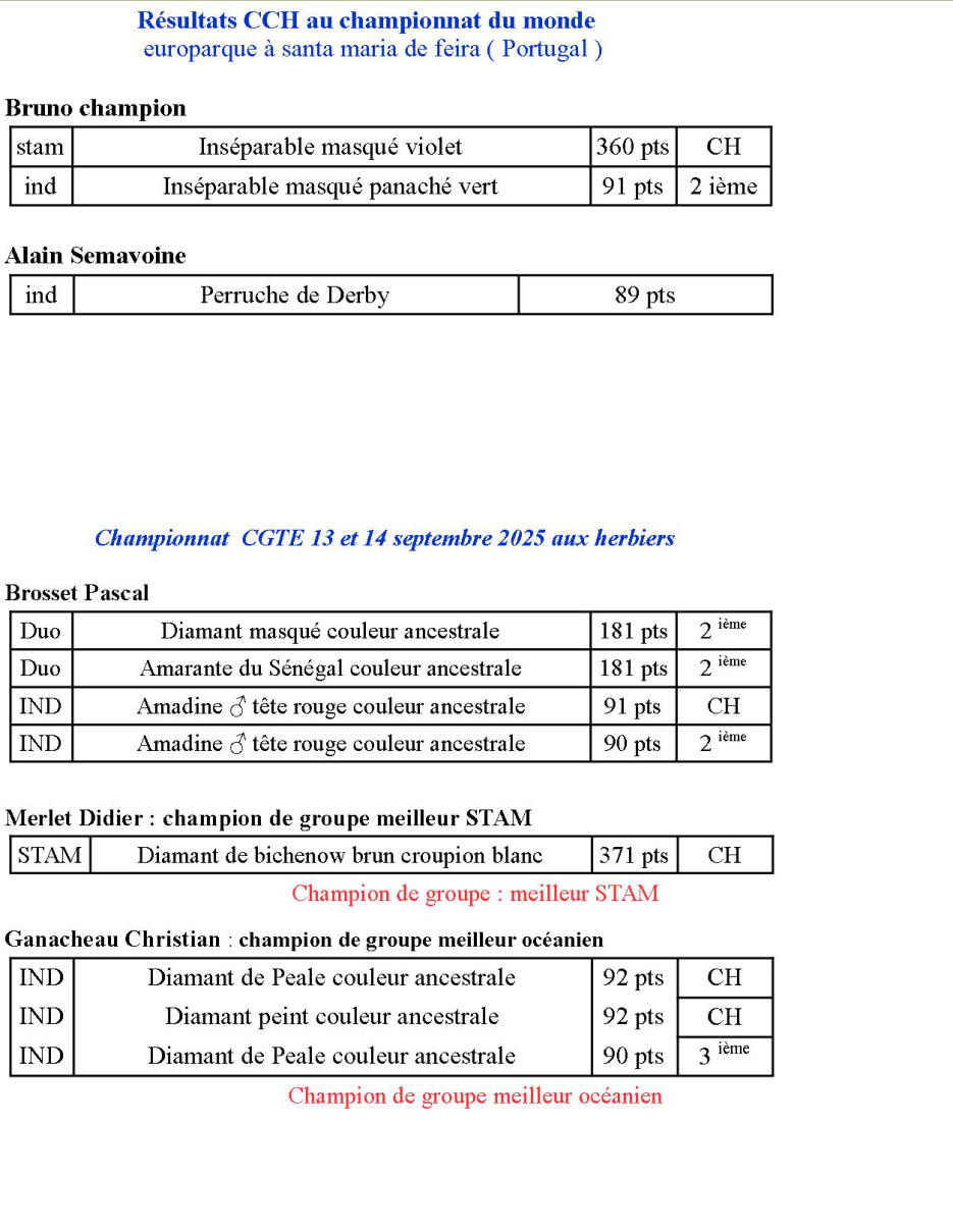 Résultats des éleveur compétiteurs du CCH au championnat de france à Agen 07 et 08 décembre 2024le CCH à participé avec 62 oiseauxArchambaud Jacques : stam Serin des canaris jaune schimel 2 ème Brosset PascalindividuelAmarante du Sénégal CHindividuelBengali zébré CHChampion Bruno individuelInséparable masqué bleu CHstamInséparable masqué violet CHindividuelInséparable masqué violet CHindividuelInséparable masqué panaché vertCHindividuelInséparable masqué panaché bleu CHindividuelInséparable masqué violet 2 èmeSection agapornis sur 6 oiseaux Bruno fini 2 èmeDelfosse Christian Individuel Touraco à joues blanches CHHudon Loïc individuelCanaris fiorino non huppé mélanique panaché CH Lelorec HervéduoTourterelle rieuse orange ( collier gris ) CHindividuelTourterelle rieuse phaeo pastel perlée ( collier blanc) 2 ème Mathé PascalindividuelDiamant mandarin gris CH