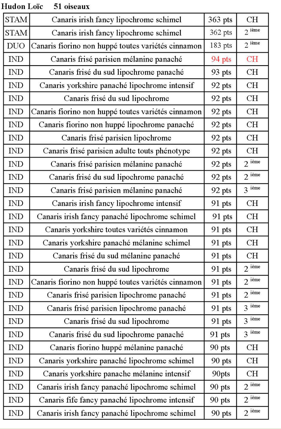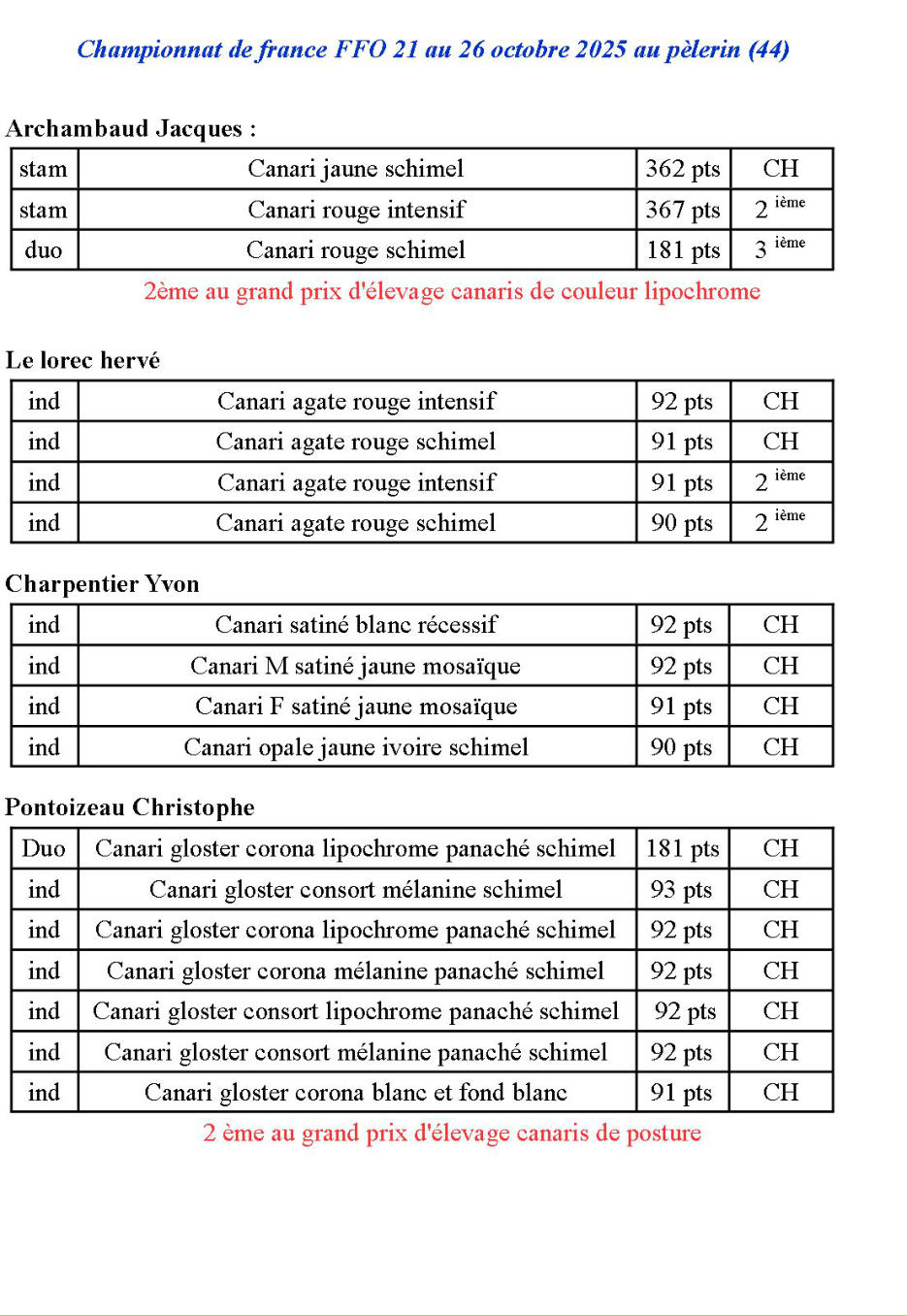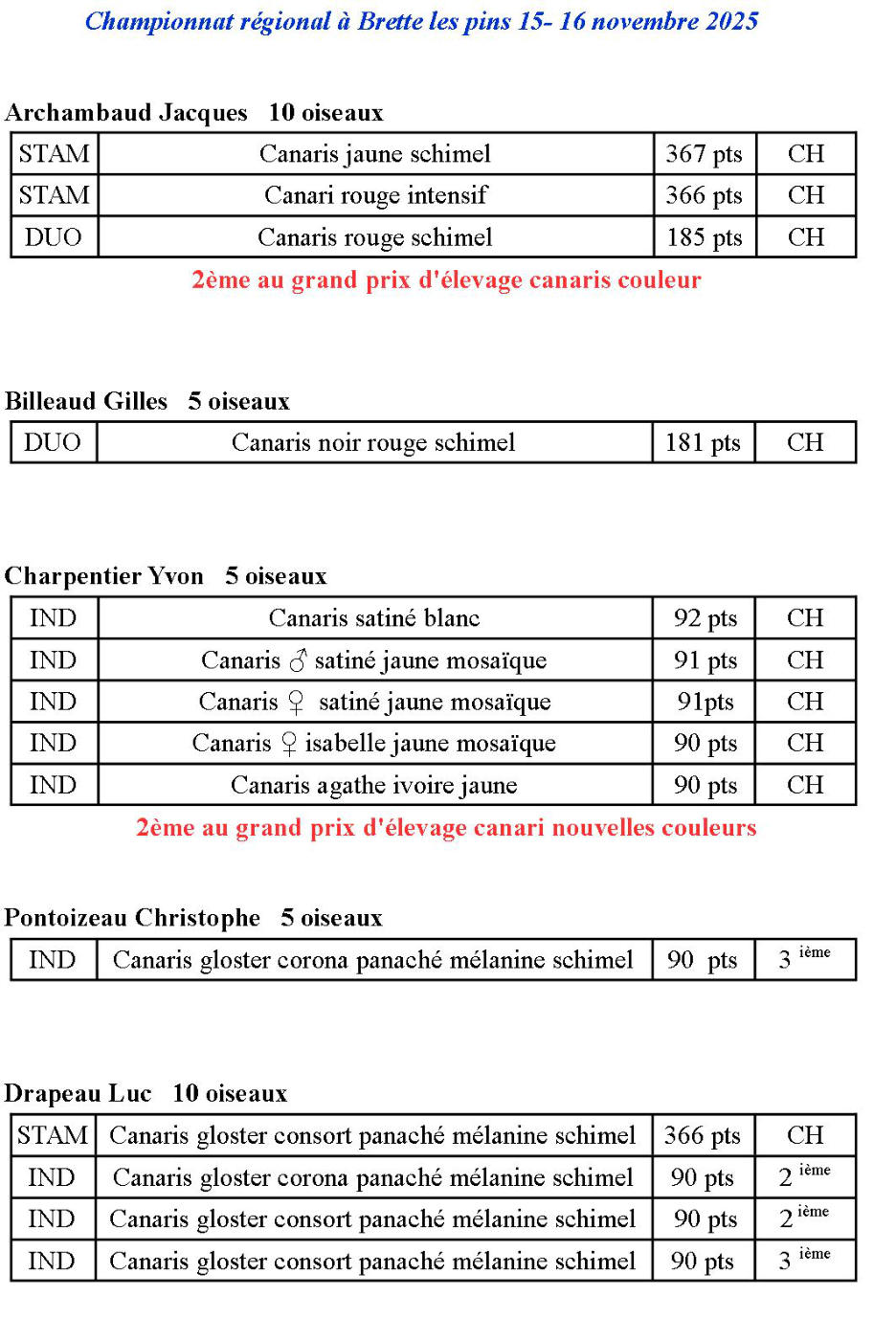 Résultats CCH au championnat régional à saint gervais les trois clochers Archambaud Jacques :Duo Canaris jaunes intensif2 èmestamCanaris jaunes schimelCHDuo Canaris rouge intensif CHDuoCanaris rouge schimel CHHudon Loïc :stamCanaris irish fancy lipochrome schimel CHindividuelCanaris yorkshire panaché lipochrome schimelCHindividuelCanaris yorkshire panaché lipochrome schimel2 ème individuelCanaris yorkshire panaché lipochrome schimel3 ème DuoCanaris fiorino non huppé lipochrome CHindividuelCanaris fiorino non huppé mélanique panaché CHindividuelCanaris frisé parisien toutes variétés à fond blanc CHindividuelCanaris frisé parisien mélanine CHindividuelCanaris frisé parisien mélanine panaché 2 ème Mathé Pascal :individuelMandarin gris ♂CHindividuelMandarin gris ♀CH individuelMandarin gris ♀2 èmeDelfosse Christian :individuelMoineau du Japon huppé couronne circulaire centréeCHindividuelMoineau du Japon autres huppes toutes couleurs CHindividuelDiamant de gould vert pastel poitrine ancestrale tête rouge CH