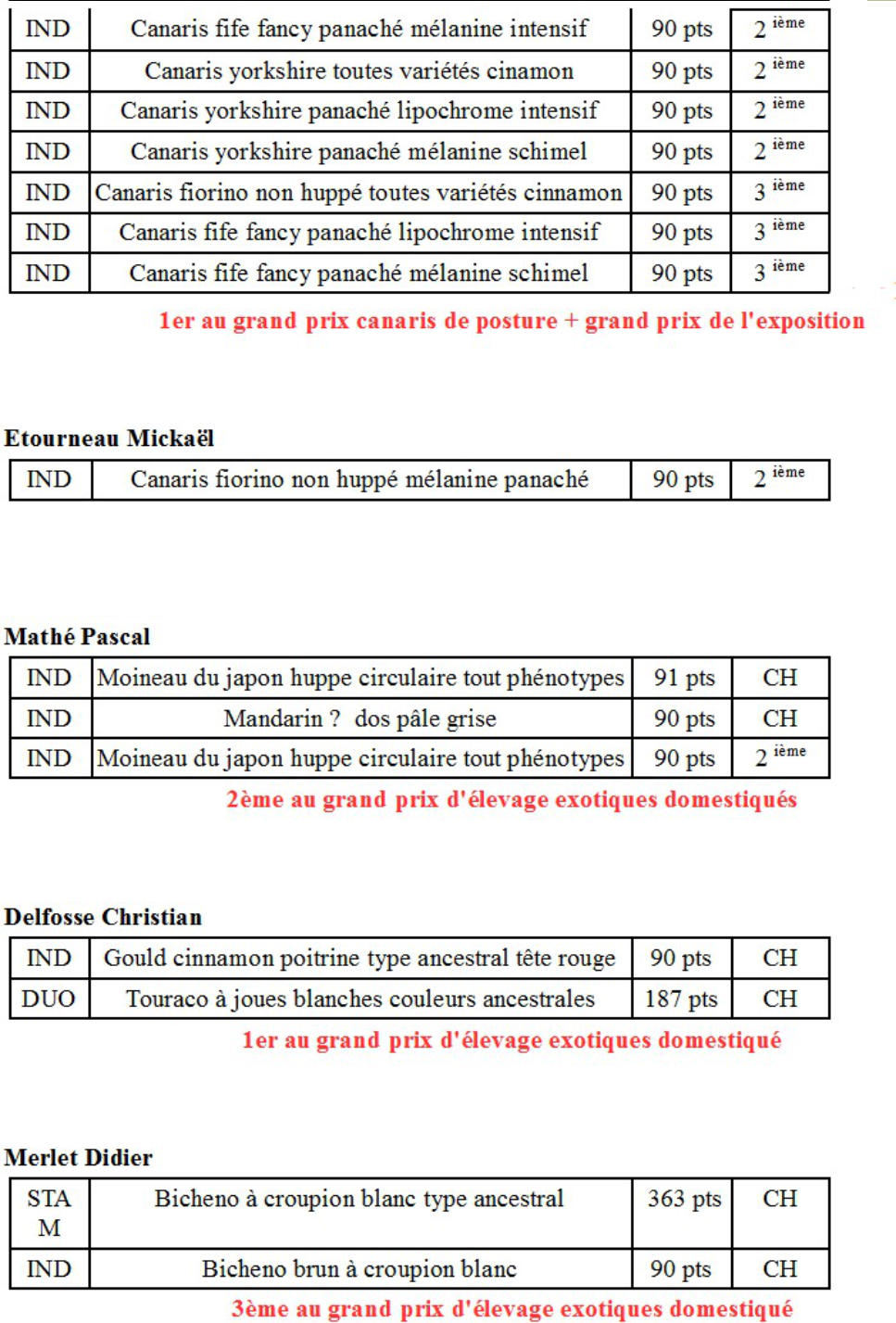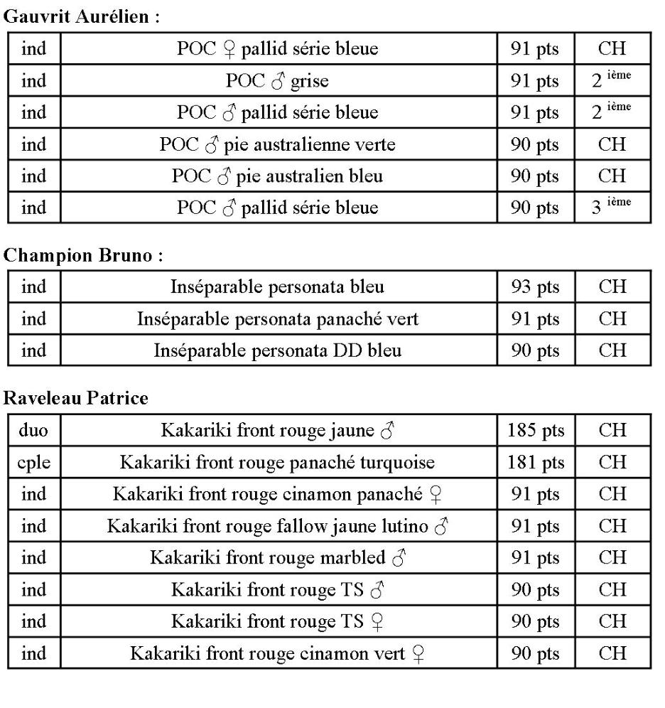 Brosset Pascal :individuelDiamant masqué CHindividuelDiamant masqué 2 ème individuelAmarante du SénégalCHindividuelAmarante du SénégalCHindividuelBengali zébré CHindividuelAmadine à tête rouge CHindividuelAmadine à tête rouge 2 ème Gauvrit Aurélien :individuelPerruche ondulée couleur grise CHChampion Bruno :individuelInséparable masqué bleu CHRaveleau Patrice :Individuel ♂Perruche de Sparrman jaune yeux rouge CHIndividuel ♂Perruche de Sparrman jaune aux yeux rouge2 èmeDuo ♂Perruche de Sparrman jaune yeux noirs CHDuo ♀Perruche de Sparrman jaune yeux noirs CHIndividuel ♂Perruche de Sparrman jaune yeux noirs CHIndividuel ♀Perruche de Sparrman jaune yeux noirs CHIndividuel ♀Perruche de Sparrman panachée CH