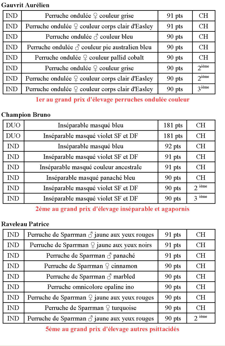 Semavoine Alain :Individuel ♂Perruche de derby CH DuoCacatoès rosalbin CHindividuelCacatoès rosalbinCH Les grands prix d'élevageMeilleur éleveur canaris de posture:Hudon Loïc fini 4 èmeMeilleur éleveur estrildidés et autres exotiques : Brosset pascalfini 2èmeMeilleur éleveur psittacidés:Raveleau patrice fini champion Semavoine Alain 5ème Champion Bruno 6 ème Gauvrit Aurélien 8 èmeGrand prix d'élevage canaris couleur lipochrome : Archambaud Jacques fini 3 èmeGrand prix d'élevage perruche ondulée couleur : Gauvrit Aurélien fini 2 èmeGrand prix d'élevage agapornis :Champion Bruno fini 3ème Grand prix d'élevage moyennes perruches : Raveleau Patrice fini championGrand prix d'élevage grande perruches :Semavoine Alain fini 2 ème Grand prix d' élevage perroquets et loris : Semavoine Alain fini championChallenge interclubs :le CCH fini 2 ème